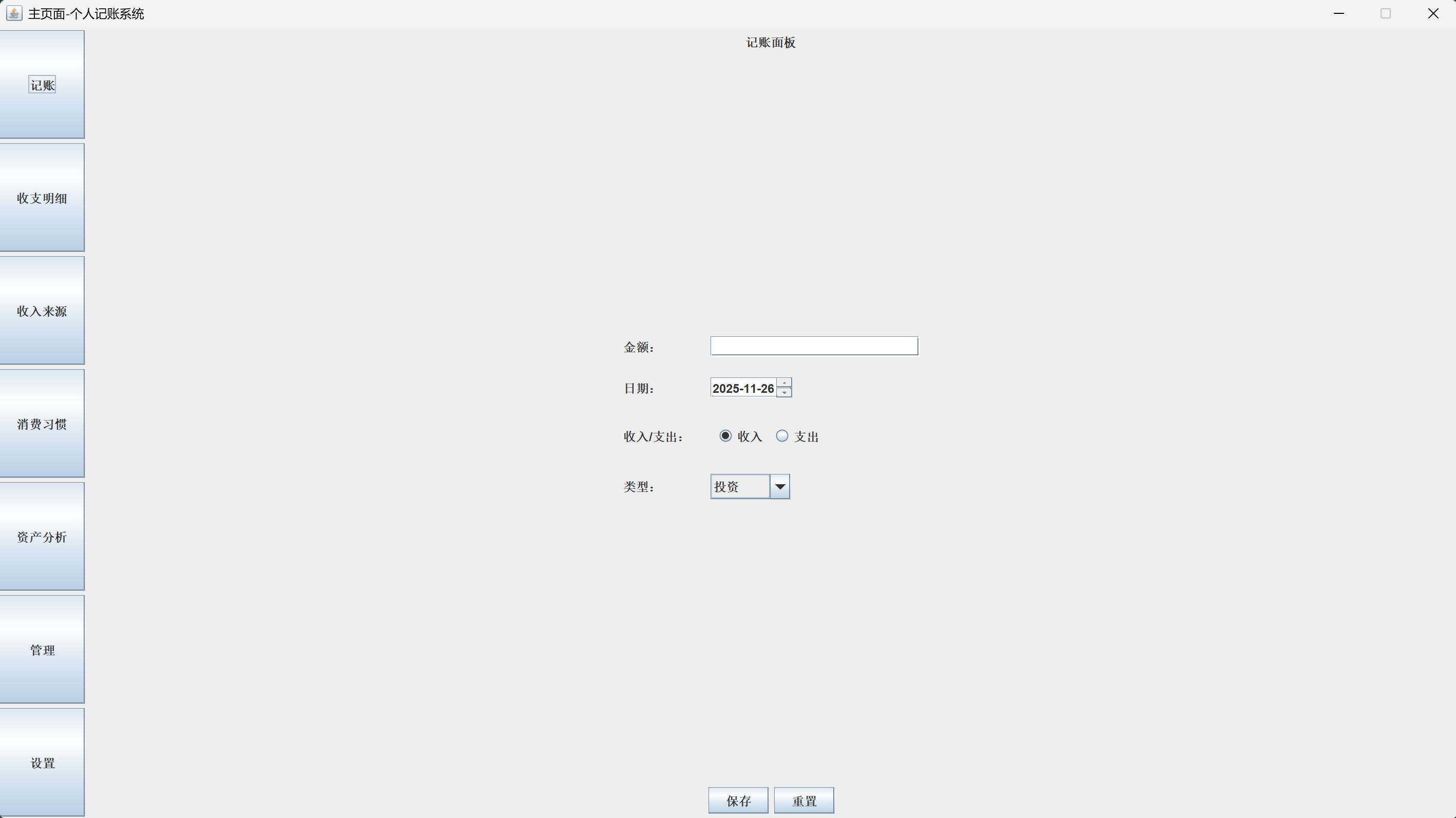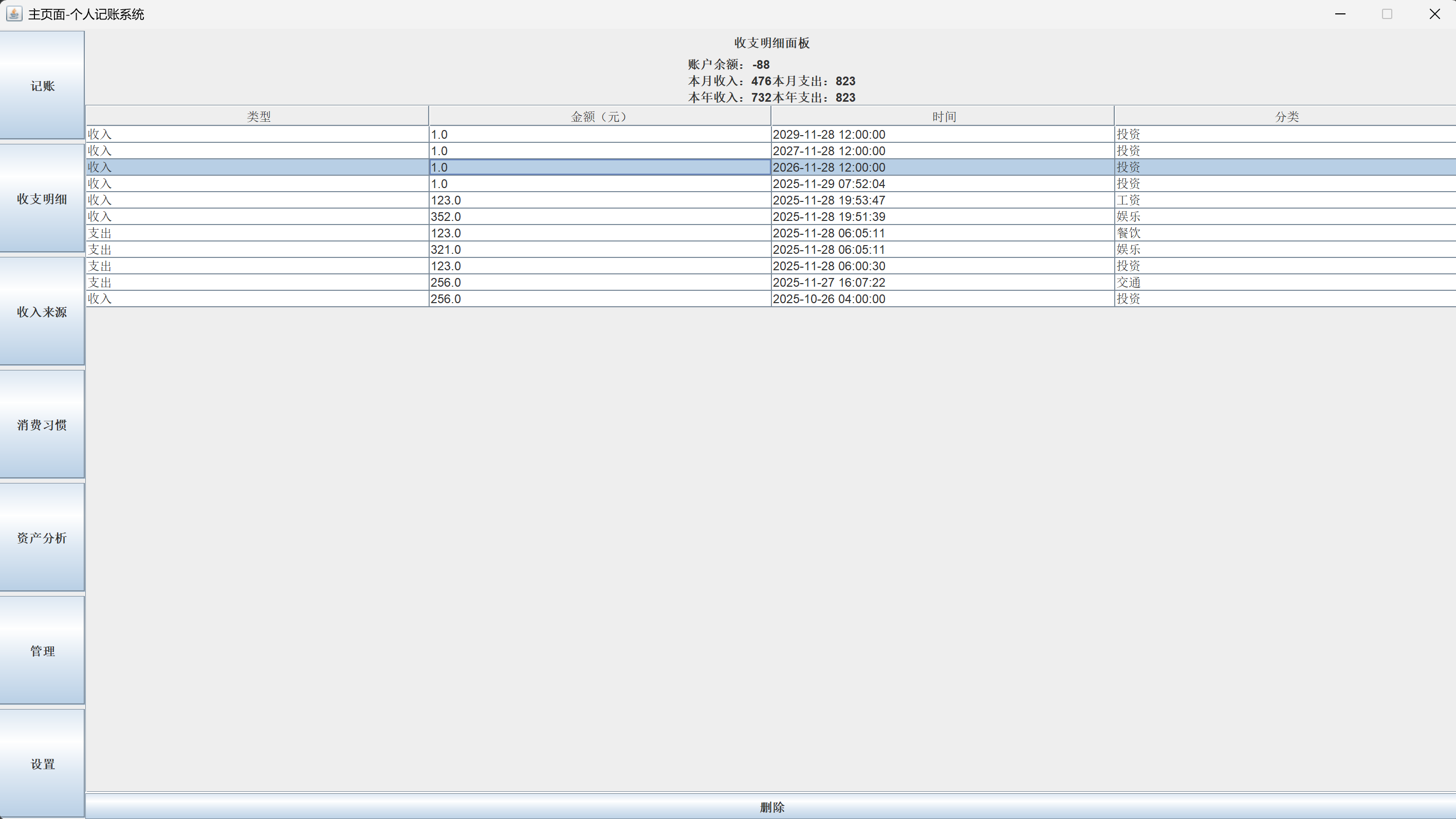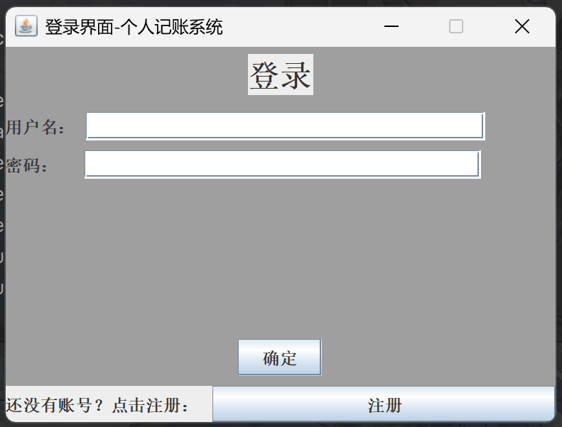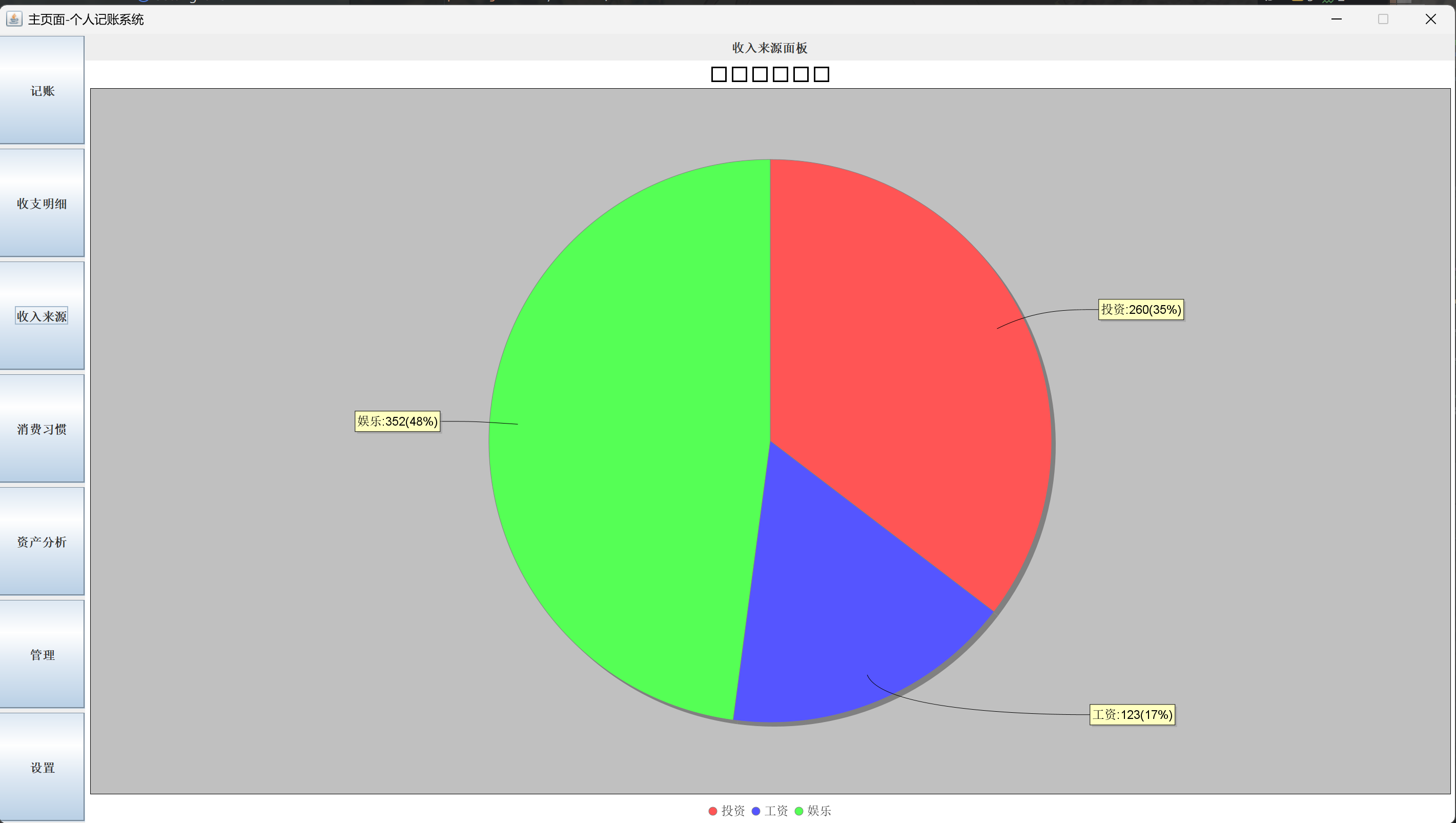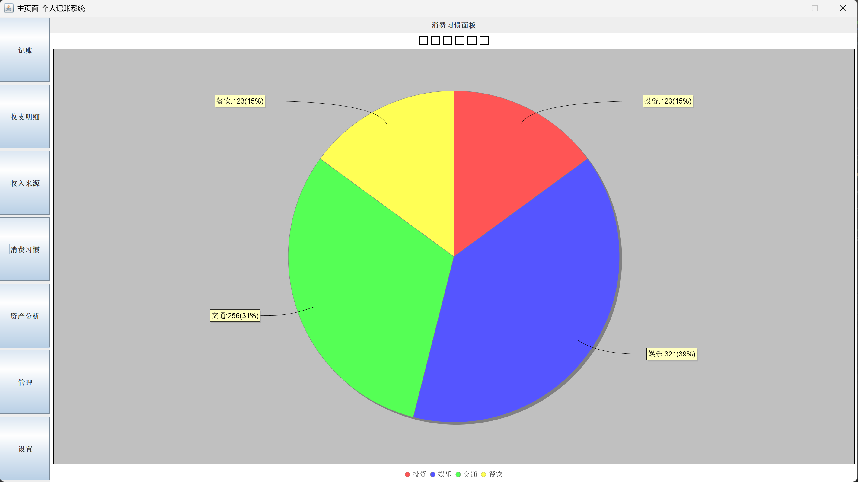 登录和注册界面用的是swing ui designer插件,这个东西可能是我没用习惯,我感觉还没手搓好用,然后我主界面以及几个功能面板都是手搓的,饼图用到了jfree,这个还挺好用,就是找不到什么资料。整个考核我写的非常简陋,就只完成了基础功能,以及考核进阶要求里面的数据持久化,一共写了刚好两天半,最后半天用来写这个README和完善了一些细节。