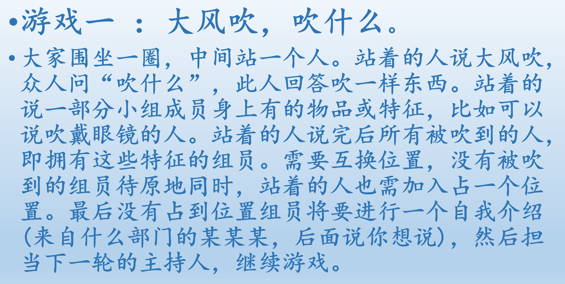 主持的学长学姐希望我们在一个社团里面能够互相熟悉,就围成一圈来轮流自我介绍,其实在游戏过程中,估摸着有一大半的朋友都自我介绍过了,不过我们还是简单的说了一下。有些朋友直接主动上才艺了。